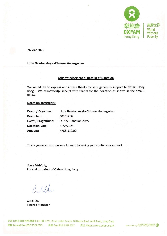 本校於「公益金便服日2024」活動日共籌得$10,850,感謝各位家長及老師的支持,款項將全數撥捐逾 167間社會福利會員機構,惠澤超過 250 萬名有需要人士。