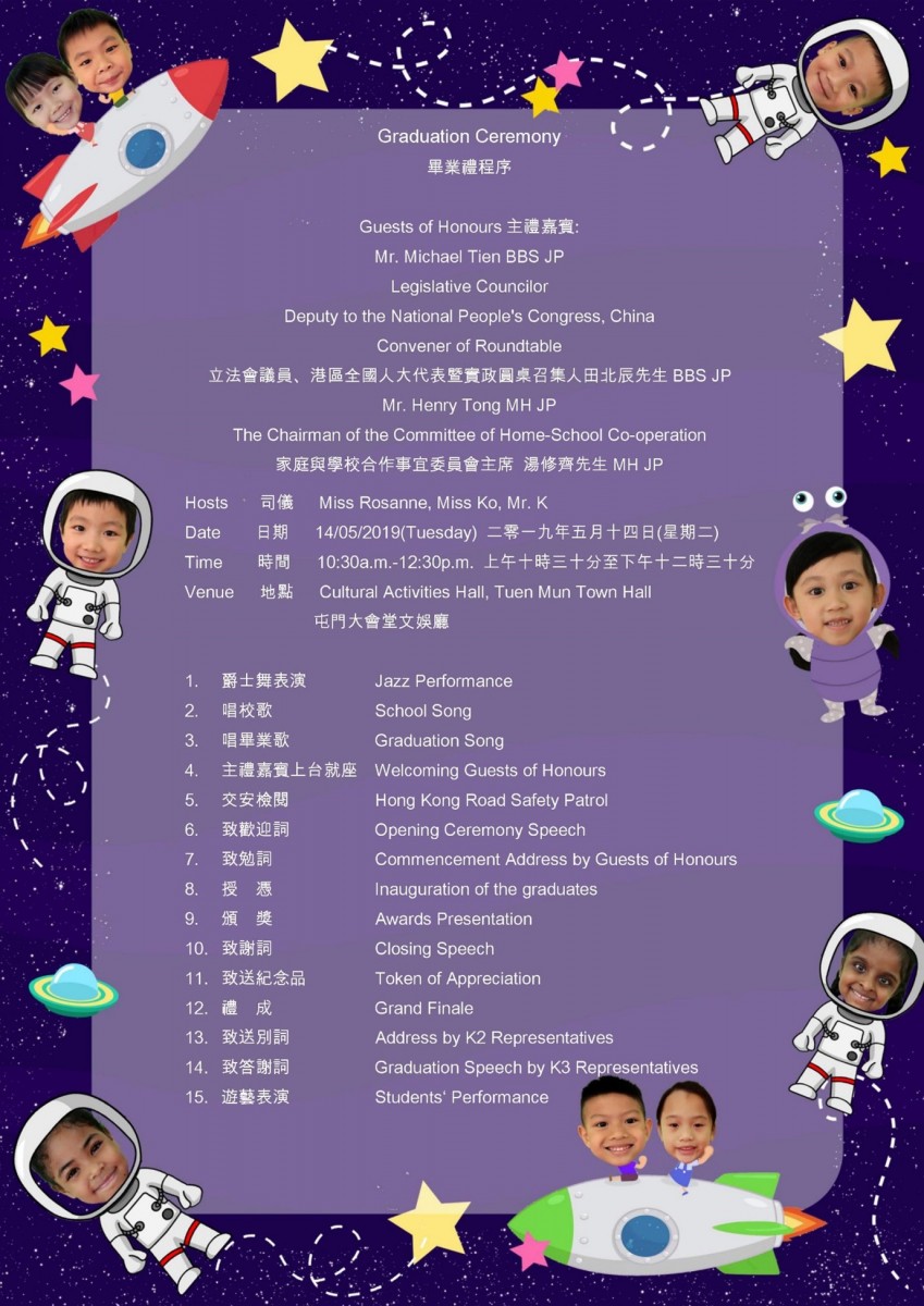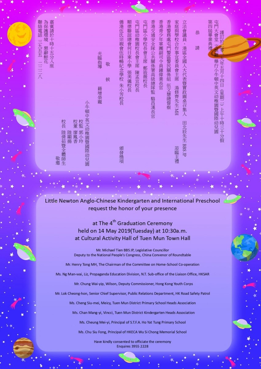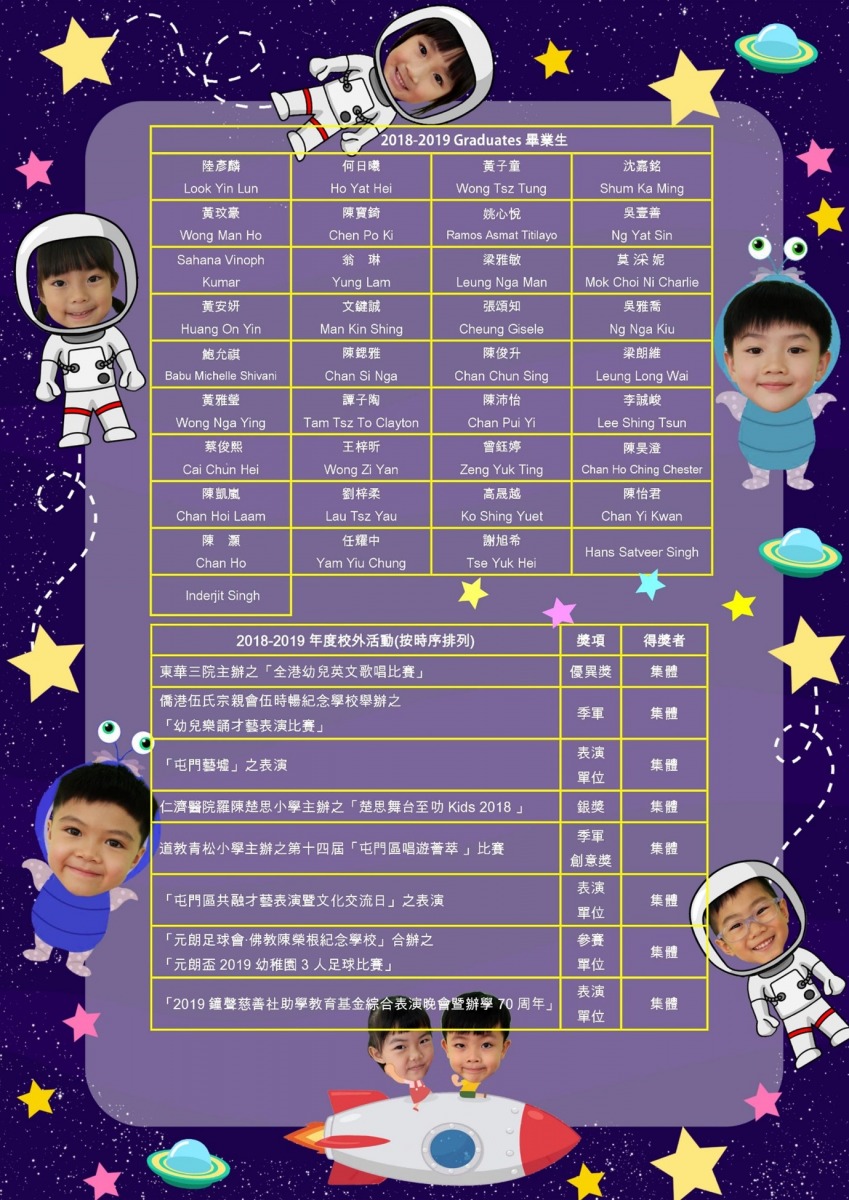 感謝第四屆畢業典禮嘉賓 主禮嘉賓: 田北辰BBS JP(立法會議員、港區全國人大代表暨實政圓桌召集人) 湯修齊MH太平紳士(家庭與學校合作事宜委員會主席) 頒獎嘉賓: 伍文慧總督察(香港警務處屯門警區警民關係組) 鄭筱薇校長(博愛醫院歷屆總理聯誼會鄭任安夫人學校) 張美儀校長(順德聯誼總會何日東小學) 朱小芳校長(僑港伍氏宗親會伍時暢紀念學校) 駱昌漢長官(香港交通安全隊公共關係署署理高級總隊監) 陳孟宜校長(屯門區幼稚園校長會主席) 恭喜第四屆畢業典禮畢業生 陸彥麟、何日曦、黃子童、沈嘉銘、黃玟豪、陳寶錡、姚心悅、吳壹善、Sahana Vinoph、翁琳、梁雅敏、莫妮、黃安妍、文鍵誠、張頌知、吳雅喬、鮑允祺、陳鍶雅、陳俊升、梁朗維、黃雅瑩、譚子陶、陳沛怡、李誠峻、蔡俊熙、王梓昕、曾鈺婷、陳昊澄、陳凱嵐、劉梓柔、高晟越、陳怡君、陳 灝、任耀中、謝旭希、Hans Satveer、 SinghInderjit Singh