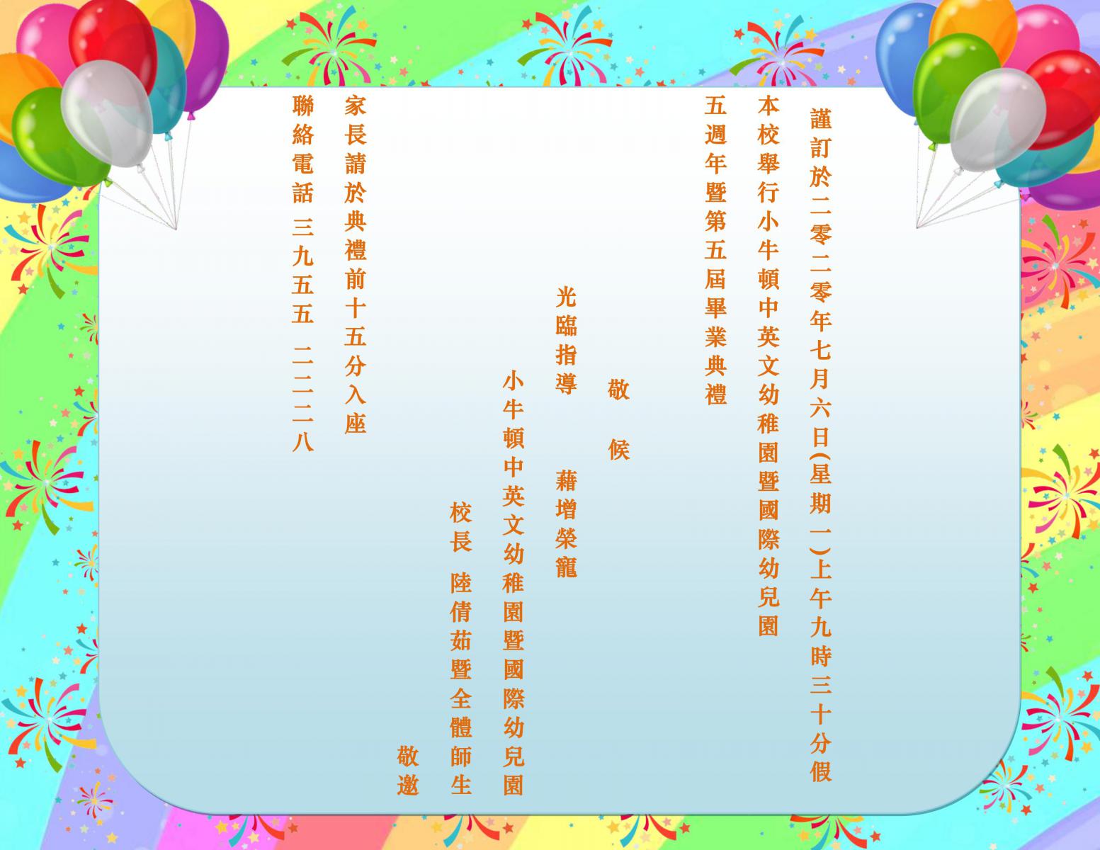 感謝第五屆畢業典禮家長以及恭喜一眾畢業生 黎棗瑤、趙子軒、馬仲言、吳誦軒、翟芷晴、陳遠喬、雷敏希、譚澔渝、樓芯攸、張樂賢、高柏瑜、盧俊龍、鄺泓淦、彭雪芝、余凱琳、姜翔、蕭因玥、李梓匡、李梓琳、張希倫、馬梓童、馮凱琳、張沅晴、彭晉樂、林鈞慈、吳俊逸、蘭 曦、吳俊良、李景新、Noor Ahmad Ali 、Muhammad Usman Ali、吳嘉莉、譚貝思、劉烈巽、張溢朗、羅鎧潼、張尚恩、姚信希、Harseerat Sidhu、李景新、霍永昇、陳譽文、甘逸、鄭芷渝、李栢軒、梁詠鈞、Raj Bahadur Singh、Garry Singh、張筱瑜